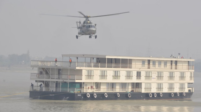 लगभग 30 से 40 मिनट तक हेलिकॉप्टर क्रूज के ऊपर मंडराता रहा और इस बीच घाट पर बैठे पर्यटक और नाविकों ने दूर से ही अपने मोबाइल से इस दृश्य को अपने कैमरे में कैद किया। कुछ लोगों ने सोशल मीडिया पर भी वीडियो और फोटो साझा किए।