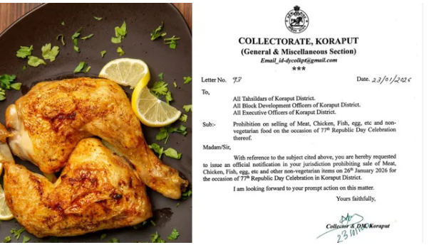 गणतंत्र दिवस के अवसर पर कोरापुट जिला प्रशासन ने बड़ा फैसला लिया है। 26 जनवरी 2026 को जिले भर में मांसाहारी खाद्य पदार्थों की बिक्री पर पूर्ण प्रतिबंध रहेगा। इस दौरान मांस, चिकन, मछली और अंडे की बिक्री नहीं की जा सकेगी।