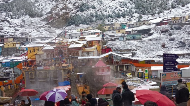 बदरीनाथ धाम में मंगलवार को मौसम के करवट बदलने से देर रात से धाम में बर्फबारी शुरू हो गई। धाम में चारों ओर बर्फ की सफेद चादर बिछ गई है। वहीं, बर्फबारी से धाम में कड़ाके की ठंड हो रही है।