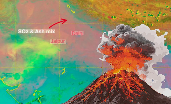 पूर्वी अफ्रीकी देश इथियोपिया में हुए ज्वालामुखी विस्फोट से निकली राख का विशाल गुबार अब तेजी से भारत की ओर बढ़ रहा है। मौसम विभाग का कहना है कि यह राख आज रात करीब 10 बजे तक पश्चिमी भारत में पहुंच सकती है। इसके बाद यह राजस्थान, दिल्ली, हरियाणा, पंजाब सहित उत्तर भारत के कई हिस्सों में फैल सकती है। इससे आसमान में धुंधलापन बढ़ने और दृश्यता पर असर पड़ने की आशंका है।