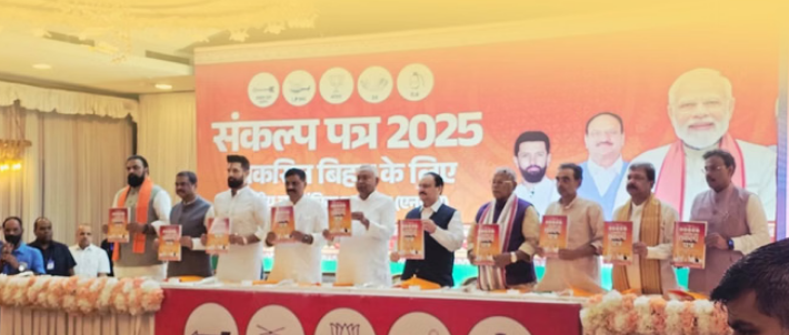 राष्ट्रीय जनतांत्रिक गठबंधन (एनडीए) ने अपना घोषण पत्र जारी कर दिया है। पटना के एक बड़े होटल में एनडीए के सभी घटक दलों के प्रमुख नेता ने मिलकर ‘संकल्प पत्र 2025’ के नाम से घोषणा पत्र जारी किया। सीएम नीतीश कुमार, भाजपा के राष्ट्रीय अध्यक्ष जेपी नड्डा, केंद्रीय मंत्री जीतन राम मांझी, चिराग पासवान और सांसद उपेंद्र कुशवाहा, बिहार भाजपा के चुनाव प्रभारी धर्मेंद्र प्रधान, भाजपा अध्यक्ष दिलीप जायसवाल, जदयू के कार्यकारी अध्यक्ष संजय झा की मौजूदगी में जारी किए गए घोषणा पत्र को विकसित बिहार का ब्लू प्रिंट बताया गया। हालंकि, घोषणा पत्र जारी होते ही सीएम नीतीश कुमार, मंत्री चिराग पासवान समेत सभी वरिष्ठ नेता चले गए। इसके बाद डिप्टी सीएम सम्राट चौधरी ने एनडीए की ओर से घोषणा पत्र के बारे में जानकारी दी।
